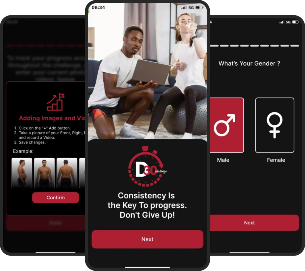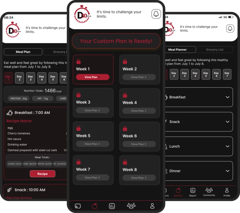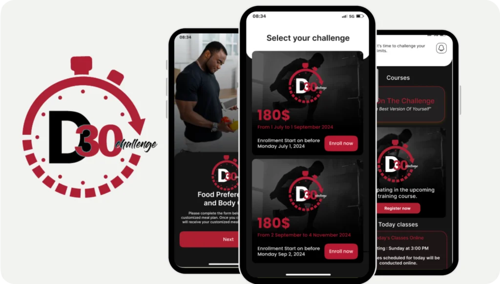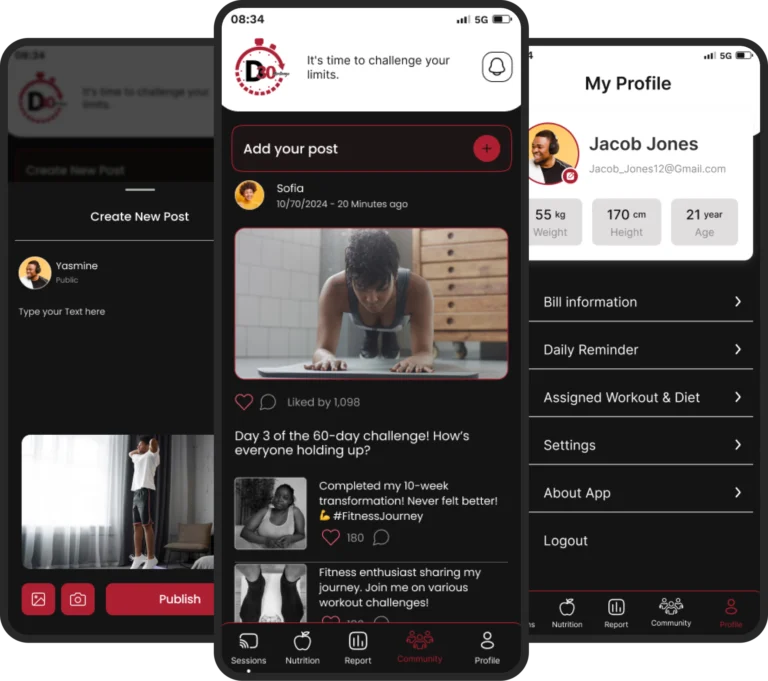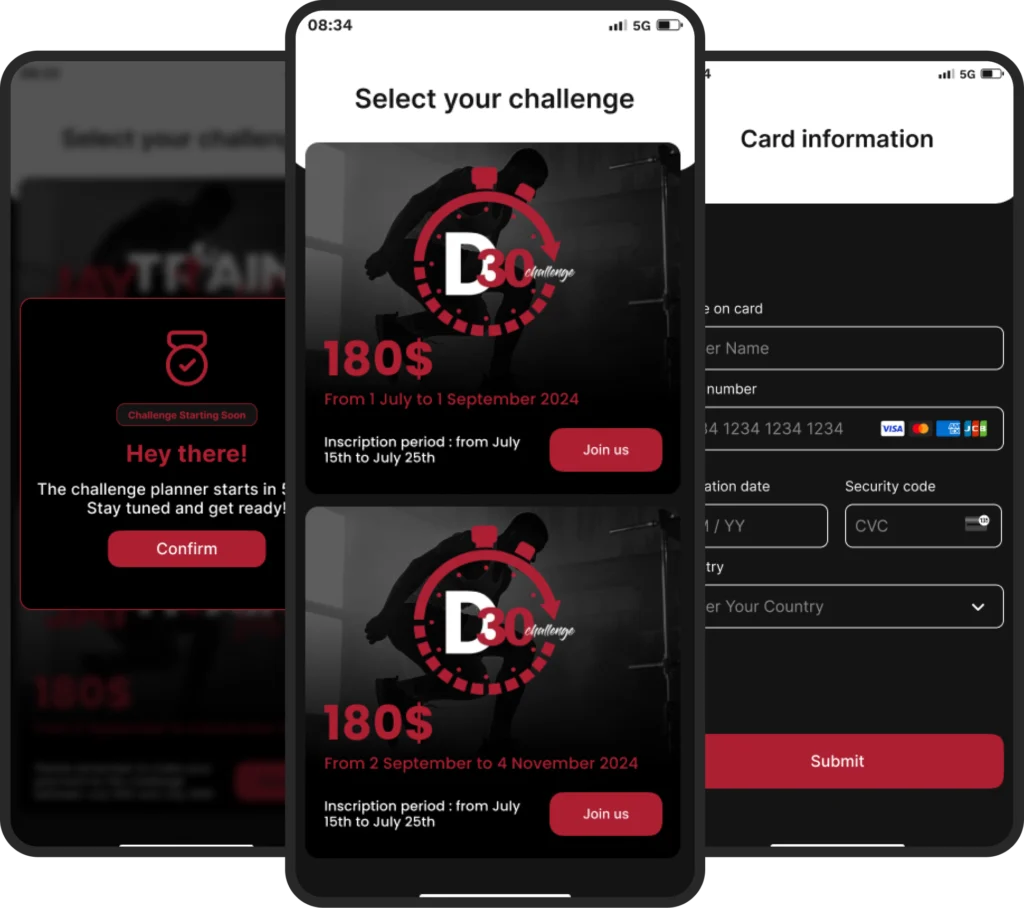 Nous avons créé une application axée sur l’utilisateur, comprenant trois éléments clés : des défis d’entraînement adaptés, un plan de nutrition hebdomadaire personnalisé et un suivi de progression motivant. Elle offre la possibilité d’entraînements en ligne ou en personne, avec des notifications pour aider les utilisateurs à rester engagés dans leur parcours de fitness.